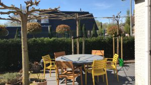 Aanplant extra dakmoerbeien. Er volgen foto’s waarbij de moerbei voorzien is van een bladerdek. Dat zal snel gebeuren gezien het aantal knoppen in de bomen.